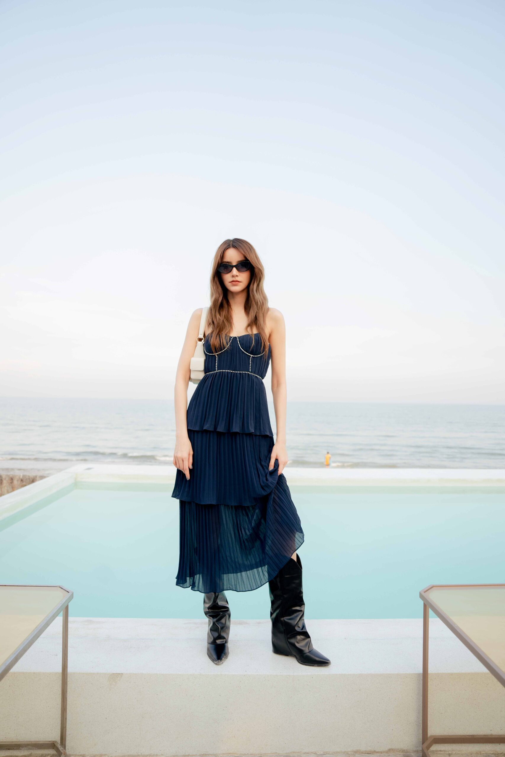 โดยไฮไลท์ในงาน การเดินแฟชั่นโชว์คอลเลกชั่นล่าสุด สปริง 2024 Beach Destination ที่มากับธีมลุคที่หลอมรวมความเป็นฤดูใบไม้ผลิที่มีชีวิตชีวา และแฝงไปด้วยความละเอียดอ่อน เข้ากับความสง่างามของผู้หญิงที่ปรากฏตัวในลุคสุดหรูท่ามกลางโมเมนต์อันน่าจดจำ เสื้อผ้าในฤดูกาลนี้ตั้งใจสรรสร้างให้ตอบโจทย์ลุคการแต่งตัวในโอกาสสำคัญหรือโมเมนต์สนุกๆ โดยมีหัวใจสำคัญอยู่ตรงการบาลานซ์ระหว่างนิยามของคำว่าหรูหราและความชิค เหมาะกับบรรยากาศกลางแจ้งที่สนุกและผ่อนคลาย ผ้าลูกไม้ลายดอกอันประณีตบรรจงได้มาปรากฏอยู่บนไอเทมหลากหลายชิ้น เพื่อสร้างลุคที่ดูมีมิติ กางเกงลูกไม้สีขาวบริสุทธิ์และเสื้อเชิ้ตเข้ากัน สามารถเลเยอร์กับบราเล็ตสีขาวทึบด้านในได้อย่างเซ็กซี่ลงตัว ไปจนถึงเสื้อเชิ้ตผ้าลูกไม้สีเบจนู้ดที่มีความโรแมนติกจากดีเทลจับสม็อค โบว์สีม่วงไลแลคประดับที่คอเสื้อ หรือจะเป็นเดรสลูกไม้แขนกุดคอปกที่ดูสมาร์ทและทะมัดทะแมง เหมาะกับโมเมนต์จิบไวน์บนเรือยอร์ชส่วนตัว เดรสสีชมพูช็อกกิ้งพิงค์กับดีเทลซีทรูผ่าด้านข้าง จั๊มป์สูทขาสั้นที่ช่วงบนให้ลุคแบบเสื้อเชิ้ตในสีเขียวสดที่มีความคล่องตัว และชุดเซตสายเดี่ยวและกางเกงขากว้างในดีเทลจับพลีตทั่วทั้งตัว นอกจากนี้ยังมีเดรสสั้นสำหรับปาร์ตี้กลางวันและกลางคืนอย่างมินิเดรสเกาะอกลายจุดสีขาวเข้ารูป และมินิเดรสแขนกุดสีดำแต่งหมุดลายดาวสำหรับยามค่ำคืน