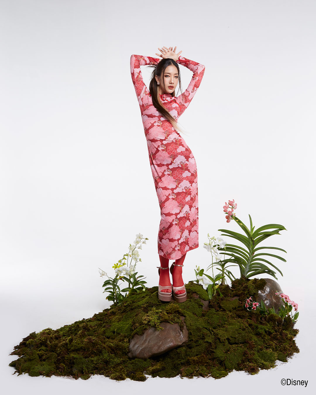 เดรสผ้ายืดลายมังกร Mushu สีแดงชมพู ที่ปรับดีไซน์มาจากชุดกี่เพ้า และเพิ่มดีเทลให้ดูทันสมัยมากขึ้น