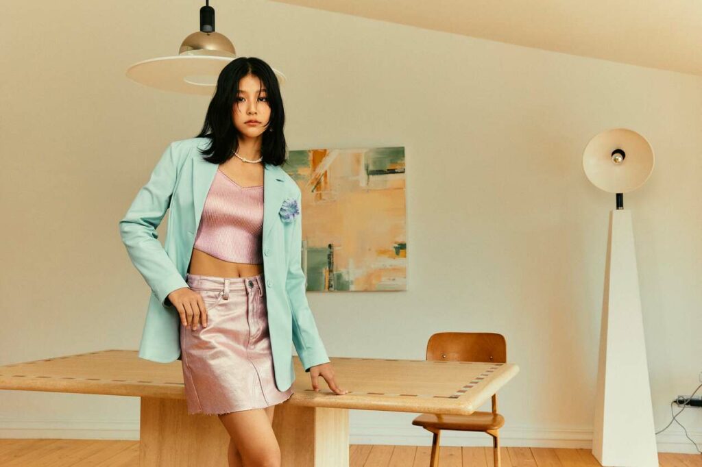 เปลี่ยนโหมดมาในลุคสาวหวานอีกนิดกับลุคที่สี่ที่มา โทนสีชมพูพาสเทล แต่เลือกใช้เนื้อผ้าเมทัลลิคที่ยังคงให้ ความเท่ เก๋ แอบซ่อนในความหวาน แมตช์กับเสื้อกล้ามและกระโปรงในโทนสีชมพู เพิ่มความสนุกด้วยเบลเซอร์ สีตัดกันอย่างสีเขียวมินท์ ก็ให้ความเป็นทางการมากขึ้น แต่ยังคงความสนุก